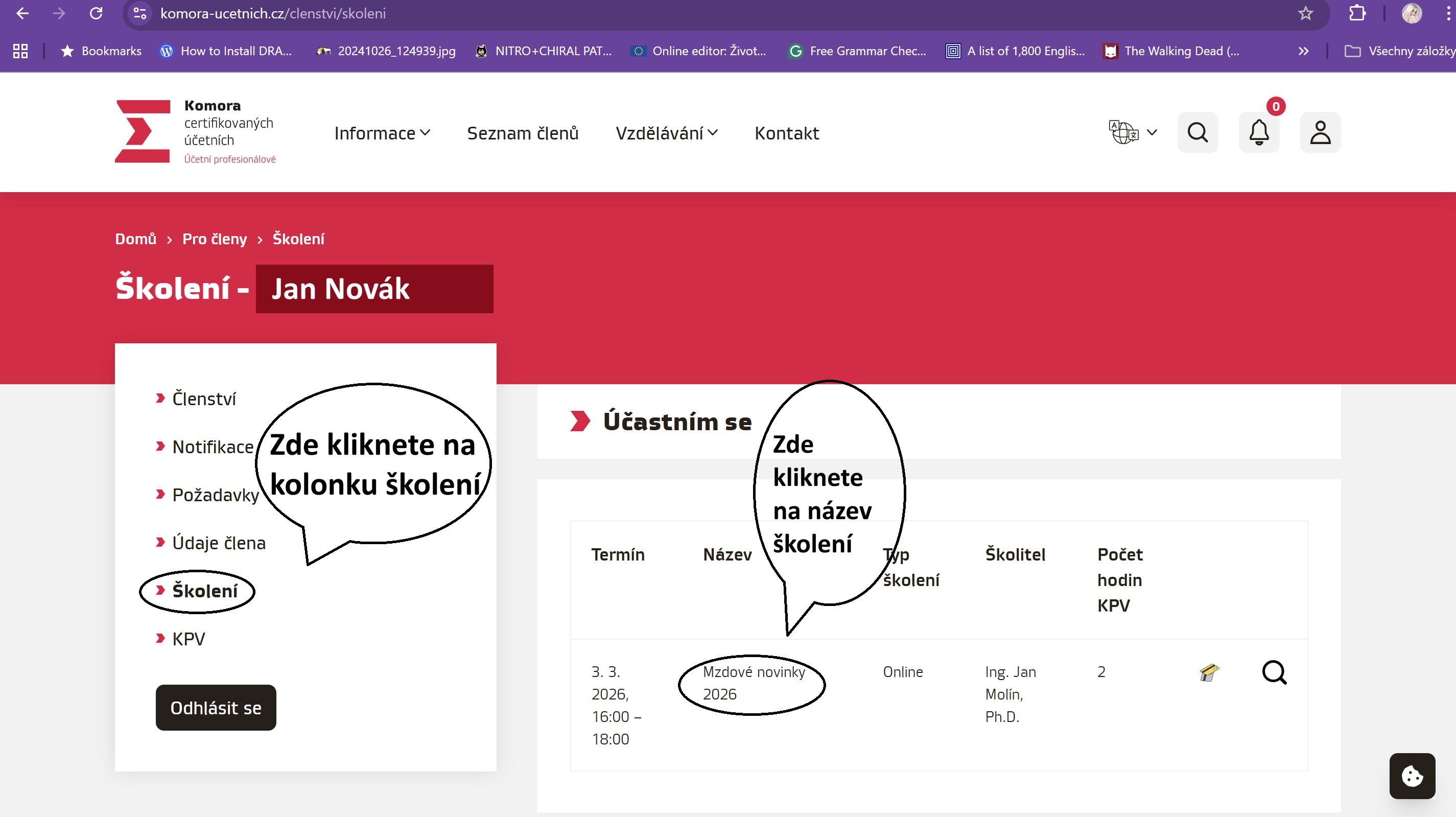 Po přihlášení se Vám zobrazí levý panel s výběrem možností. Kliknete na možnost “Školení”, která Vám zobrazí školení, na která jste se přihlásili. Pro jejich otevření stačí klinout na název školení. Nejvíce aktuální seminář bude vždy vidět jako první.